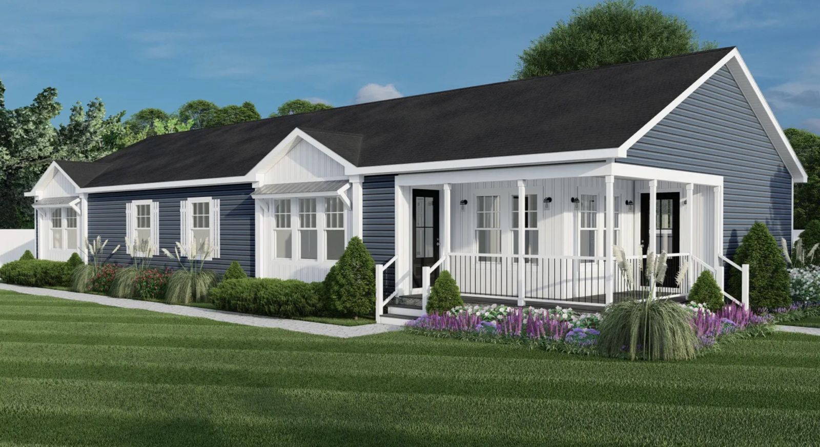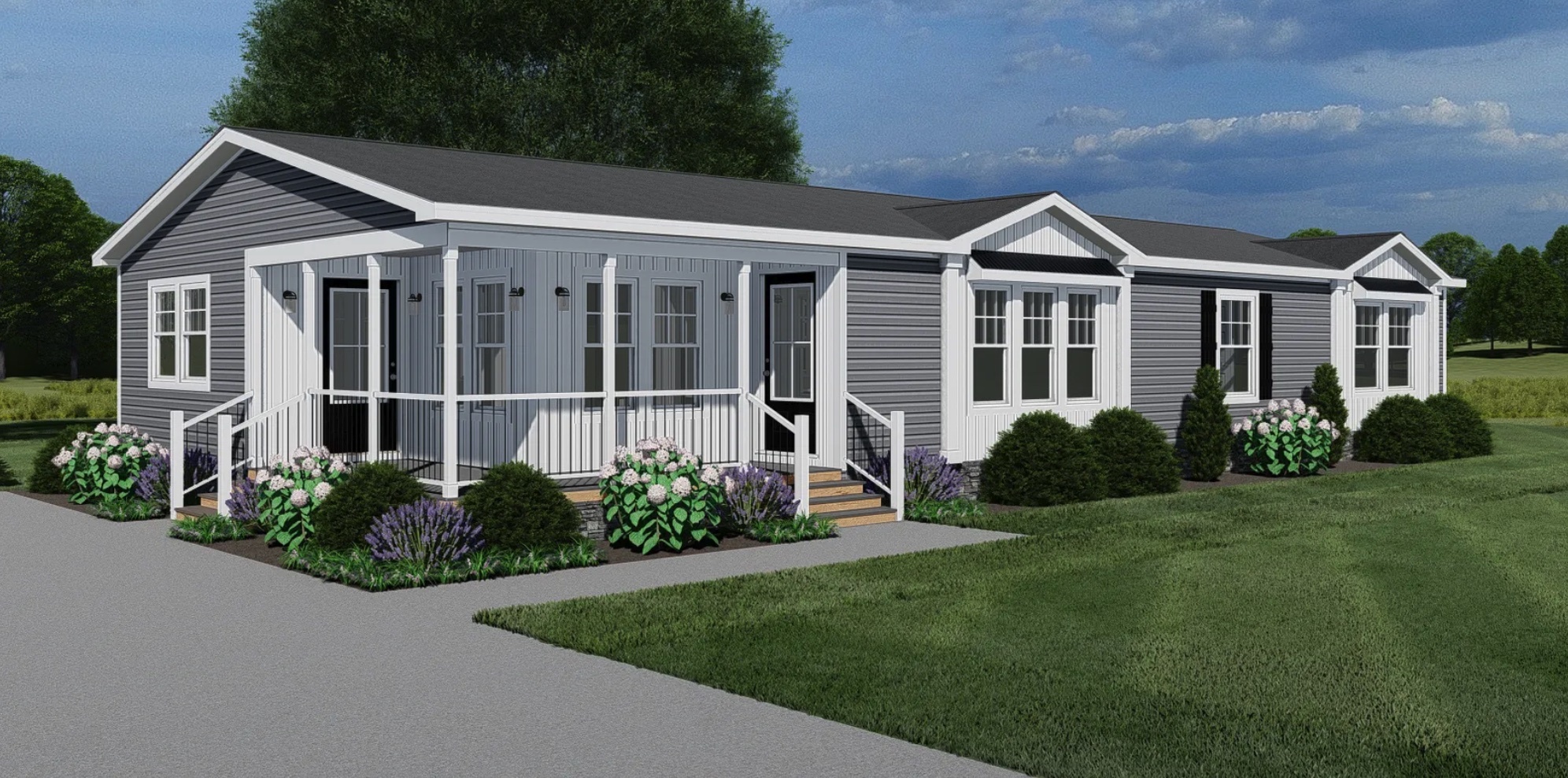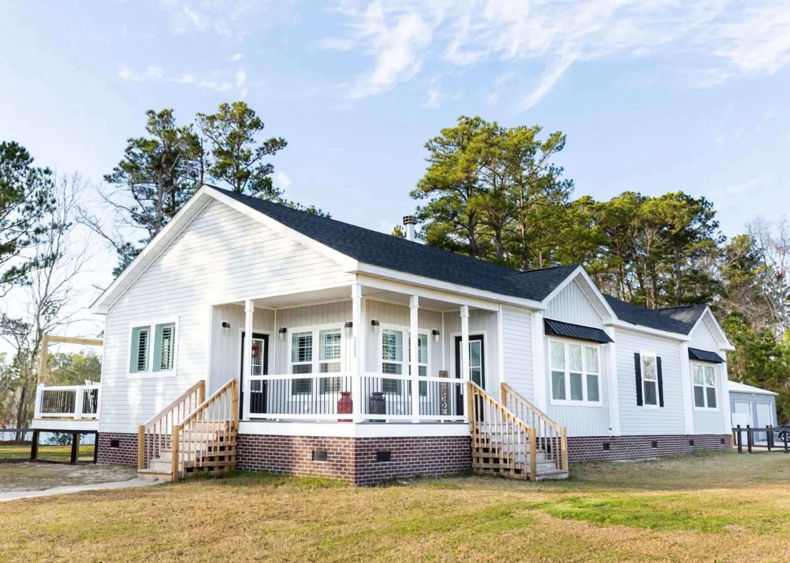 A new manufactured or modular home (usually 1,600–2,200+ SF, 3–4 bedrooms) is set on a permanent foundation, finished with skirting, porches, and decks as needed.