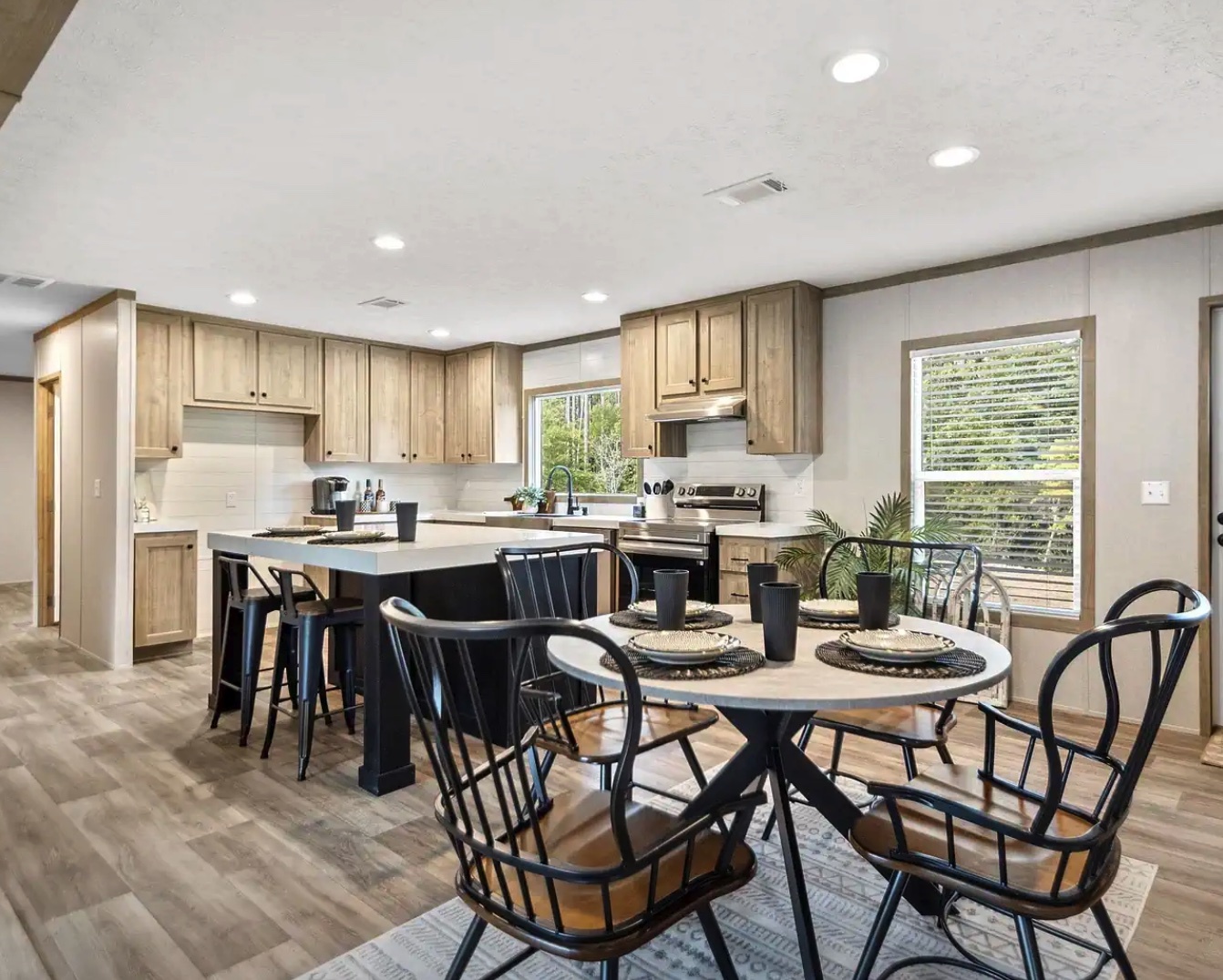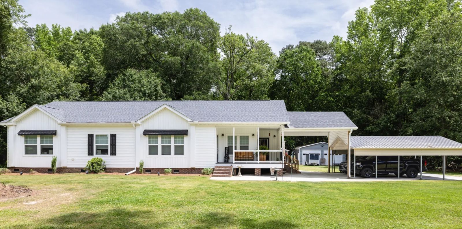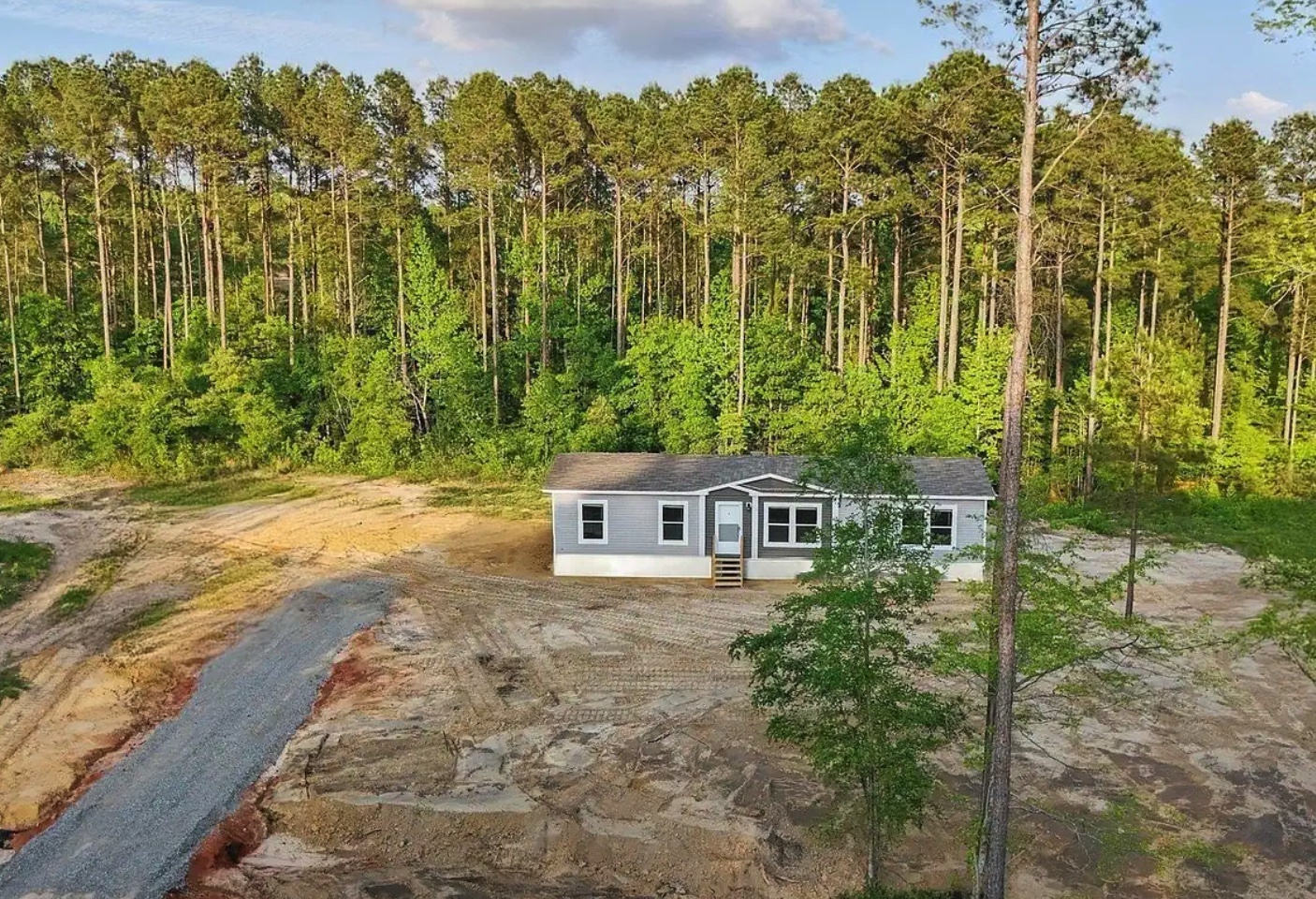 A new manufactured or modular home (usually 1,600–2,200+ SF, 3–4 bedrooms) is set on a permanent foundation, finished with skirting, porches, and decks as needed.
